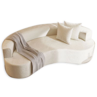 A warm, inviting cream couch with a monochromatic background. Subtle touches like trees, a rug, and curtains may be added for extra coziness.